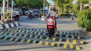 Polisi tidur di Jalan Pemuda, Klaten, Jawa Tengah, baru-baru ini menjadi viral karena desainnya yang ekstrem. Marka kejut empat baris yang berjejer di jalur lambat