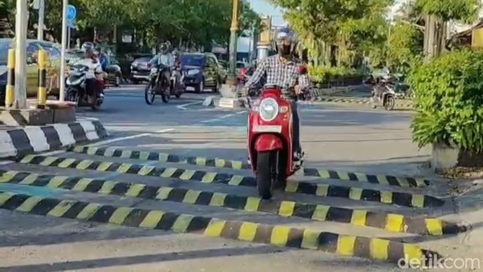 Polisi tidur di Jalan Pemuda, Klaten, Jawa Tengah, baru-baru ini menjadi viral karena desainnya yang ekstrem. Marka kejut empat baris yang berjejer di jalur lambat jalan tersebut menyulitkan pengendara, bahkan mengakibatkan becak motor terjebak.